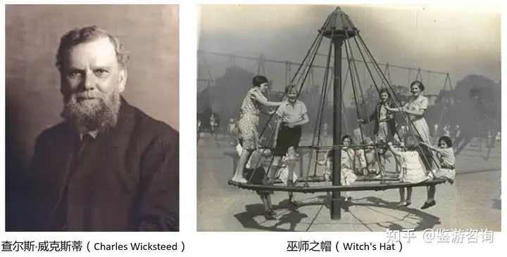 再来到英国,英国的工程师、商人和企业家查尔斯·威克斯蒂(Charles Wicksteed),发明了很多游乐设施,例如现代滑梯和秋千,以及被称作巫师之帽(Witch's Hat)的旋转设备。1921年,他创立了威克斯蒂公园(Wicksteed Park),是英国无动力游乐场的早期样板。