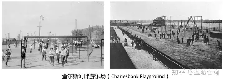 随着游乐场地的快速发展和多样化,波士顿开始出现了开放给公众的查尔斯河畔游乐场(Charlesbank Playground),有围栏、有花园、有秋千、梯子、跷跷板等设施,还有一条跑道和一个沙园,甚至有划船和淋浴的设施。土地和设施由公园署提供,乐园的运营由私人组织进行。波士顿的成功经验,吸引了其他九座城市来学习,进一步推广了无动力乐园。