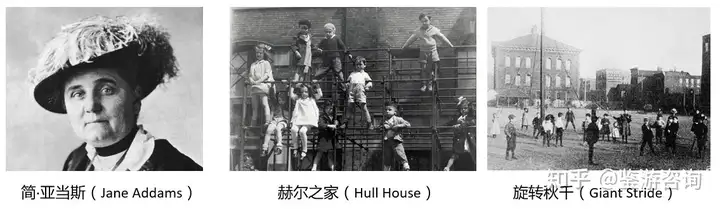 来到芝加哥,社会活动家简·亚当斯(Jane Addams)创办了全美最负盛名的睦邻组织 - 赫尔之家(Hull House),其中有个占地接近一英亩(约4千平米)的游乐场,有沙坑、秋千、积木、座椅、小型手球场和垒球场,以及一种新型的游乐设施“旋转秋千(Giant Stride)”。赫尔之家被称为第一座“样板游乐场(Model Playground)”,由一位警察和有经验的学生/老师监管。