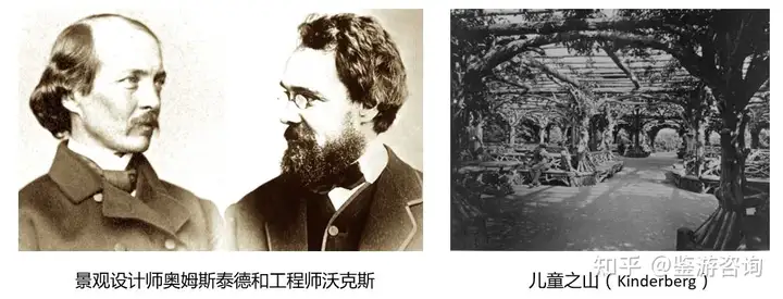 来到纽约,景观设计师奥姆斯泰德(Olmsted)和工程师沃克斯(Vaux),在中央公园联手做了一个设计,叫做“儿童之山(Kinderberg)”,主要是一些攀爬设备和长椅。这个设计现在看来非常简单和朴素,但是对于游乐场的启蒙有着重要意义,它被作为是纽约游乐场的起源。